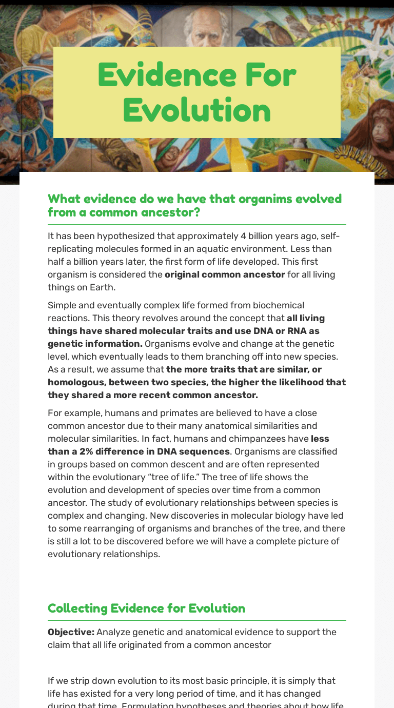 A fossil is preserved evidence of'on oranum thad evidence of past liq. We would assume that the last organisms in the evolutionary chain would be the most complex. Species may share similar physical features because the feature was present in a common ancestor (homologous structures). Today, the major pieces of evidence for this theory can be broken down into the fossil record, embryology, comparative anatomy, and molecular biology. Below on your worksheet or on a numbered sheet of paper. Distinguish between natural selection and artificial selection. According to the geological law of . Which of the following does not provide evidence for evolution? Color code each of the bones according to this key: . Outline the evidence for evolution provided by the fossil record. Evidence of evolution answer key. Fossils provide solid evidence that organisms from the past are not the same as those found today, and fossils show a progression of evolution. 3 the fossil record is the only evidence for evolution by natural selection.